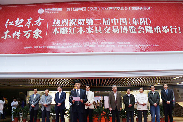 来自各级的领导嘉宾、行业协会代表、企业代表以及来自全国各地的优秀红木家具经销商等出席开幕式。东阳市委书记黄敏在开幕式上致欢迎词,中国家具协会会长朱长岭以及复星地产执行总裁、浙商建业总裁刘文东现场致辞,中国林产工业协会执行会长王满宣布开幕。