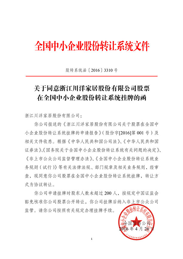 2016年4月26日,川洋家居在“新三板”即全国中小企业股份转让系统正式挂牌!股票代码:837386。