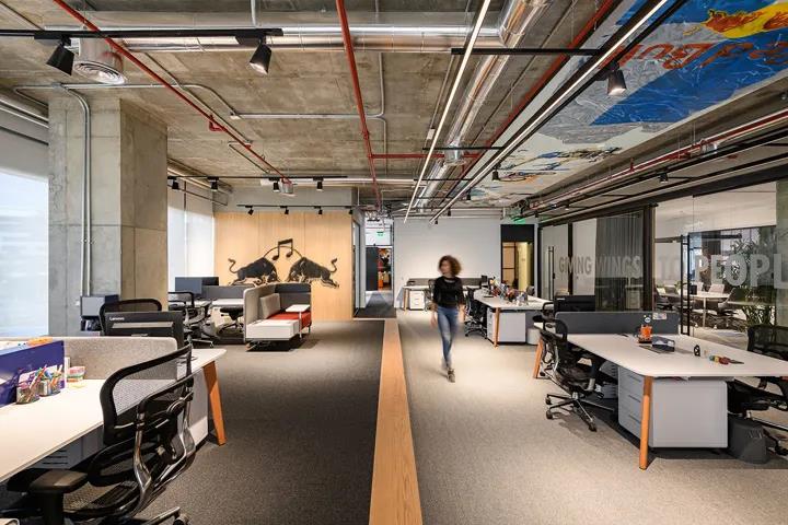 本案的设计理念正是基于红牛这种核心价值观的体现,即自豪感、勇气、创造力和创新精神。开放的平面布局,处处彰显极限运动的创作画面,瞬间给人们带来沉浸式感官体验,激发心底的活力。设计团队由此创建了一个强化品牌精神的办公空间;一个将红牛多元文化融合在空间设计中的办公环境,一个让人激情迸发的能量帝国。